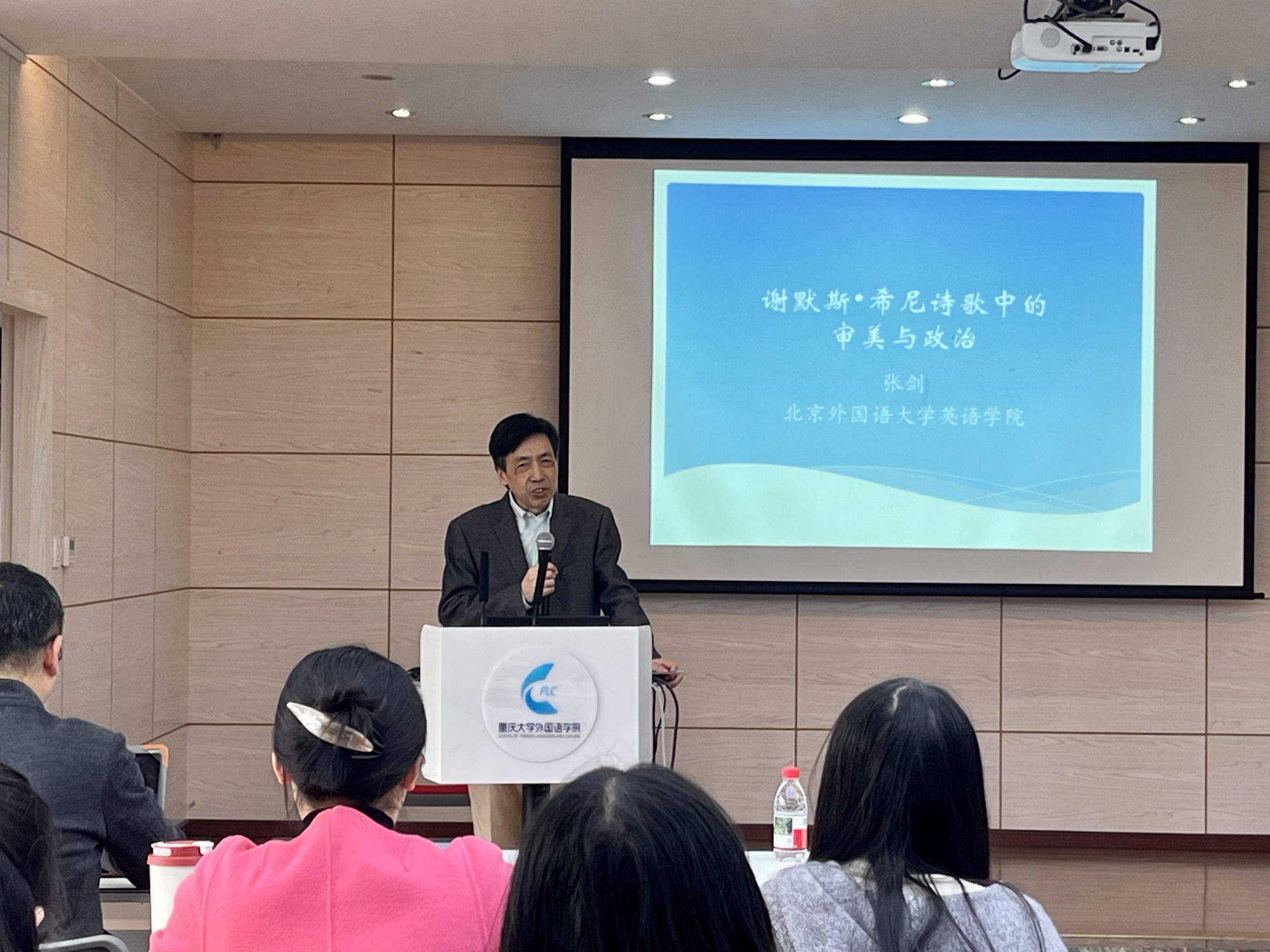 2025年11月13日下午,北京外国语大学张剑教授莅临重庆大学外国语学院,于外国语学院501报告厅作了题为“爱尔兰诗人谢默斯·希尼诗歌中的审美与政治”的学术讲座。本次讲座由王江教授主持,学院师生40余人到场聆听。
