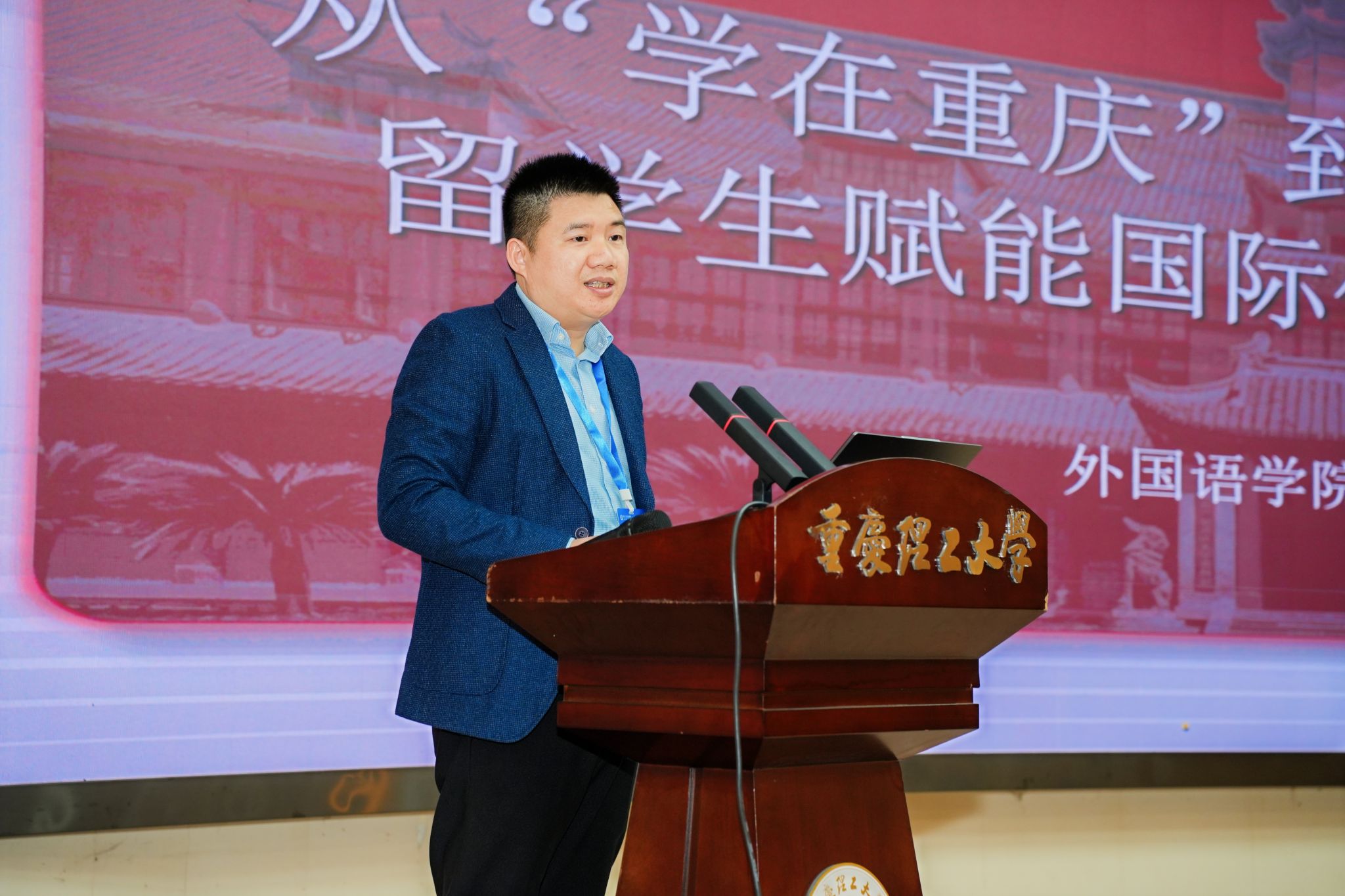 外国语学院院长莫启扬教授、副院长符存教授携学院教师团队参会。符存教授在论坛上作了题为“从‘学在重庆’到‘传向世界’:留学生赋能国际传播的实践探索”的主旨报告。报告结合重庆大学国际语言学的实践经验,系统阐释了从“学在重庆”到“传向世界”的留学生国际传播赋能路径,引发了与会专家的热烈反响。