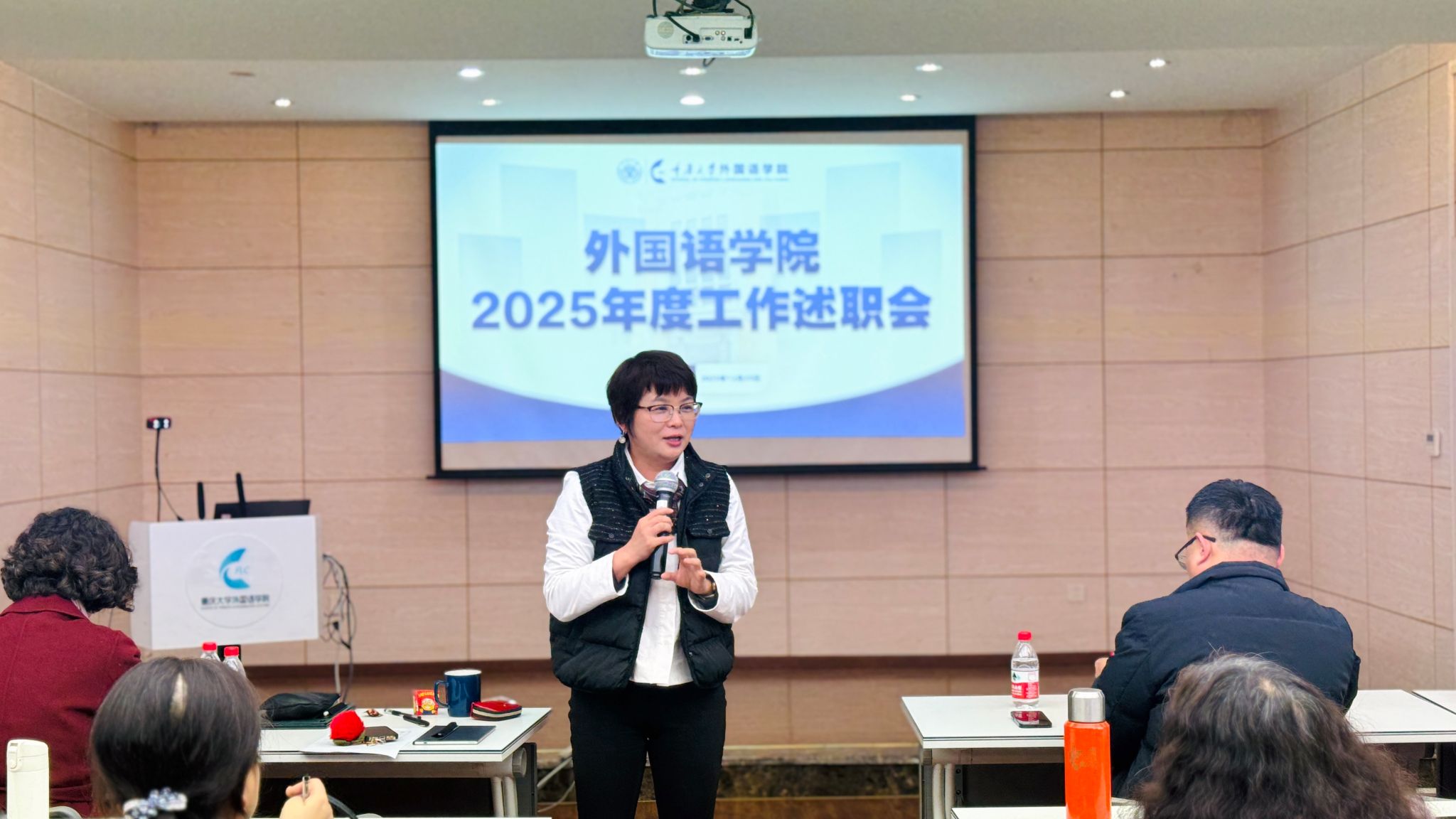 2025年12月25日下午,外国语学院2025年度述职考核会在学院楼501会议室举行。学院全体教授、各二级单位负责人及绩效工资工作小组成员参加了本次会议,会议由党委书记李小辉主持。