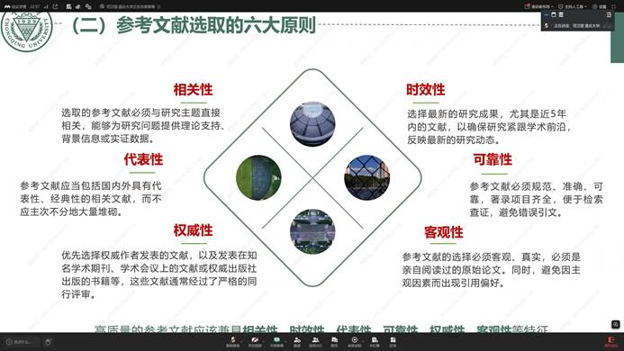会议伊始,陶叶茂老师针对毕业论文参考文献的规范化书写进行了细致讲解。结合近期任务书提交的节点,陶老师从细节出发,重点剖析了参考文献写作中常见的格式误区。她通过展示具体案例,说明了同学们在标点符号使用(如半角/全角区分、直/弯引号混用、中英文标点错乱)、空格规范以及参考文献排序中存在的常见问题。此外,她还就中文期刊(CSSCI、北大核心)与外文期刊的质量把关给出了建议,鼓励同学们以严谨的态度对待论文写作的每一个细节。
