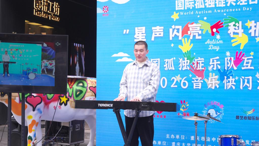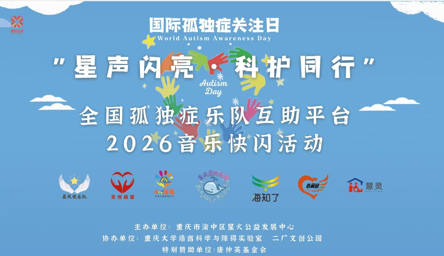 2026年4月2日,国际孤独症日当日,外国语学院康鑫团队(重庆大学语言科学与障碍实验室)助力以音乐为桥、以公益为媒的“星声闪亮” “鲸跃共生”全国孤独症乐队互助平台快闪公益活动,活动在重庆市渝中区举行,联动重庆、四川、广西、贵州、河南、江苏等地孤独症乐队共同参与,用旋律点亮星光,用关爱温暖童心。