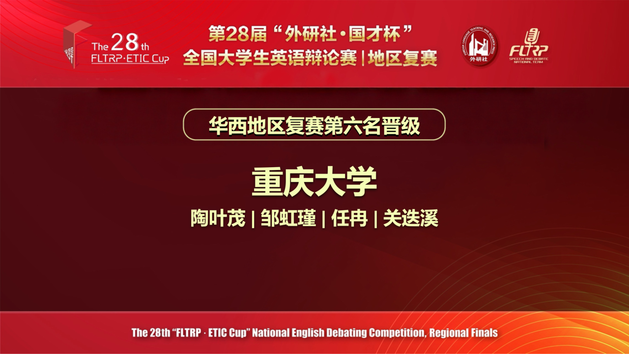 2026年4月18日-19日,第28届“外研社•国才杯”全国大学生英语辩论赛华西赛区复赛在线上举行,重庆大学两支队伍荣获金奖并晋级国赛,其中2人荣获最佳辩手,创下我校在该赛事地区赛成绩的历史新高。